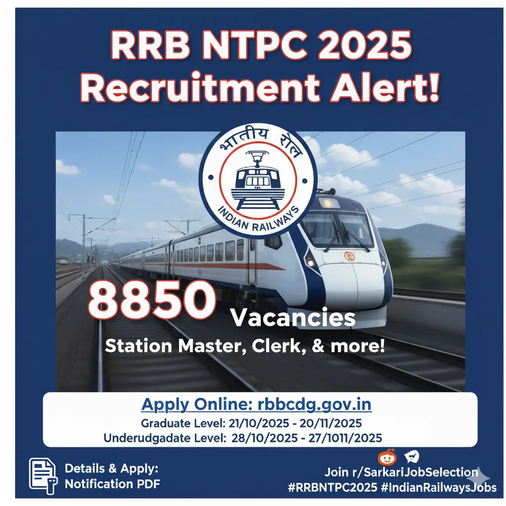 Overview: The Railway Recruitment Board (RRB) has announced RRB NTPC Recruitment 2025 for 8850 Station Master, Clerk, and other posts in Indian Railways. Eligible candidates with a 12th pass certificate or Graduate Degree can apply online from 21/10/2025 to 27/11/2025 via the official website (rrbcdg.gov.in). This is a golden opportunity for Indian Railways Jobs 2025 with a pay scale of Rs. 19,900-35,400. Explore RRB NTPC 2025 eligibility, syllabus, exam dates, and application process below.